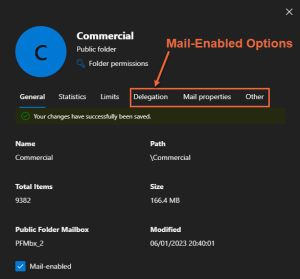 - Clicking the \Commercial folder name brings up a window on the right-hand side. Check the Mail enabled checkbox at the bottom, then click Save.