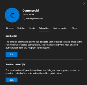 - The Delegation tab allows you to assign either Send As or Send on behalf permissions. Setting Send As means gives the user the option to send e-mail directly from the mail enabled public folder e-mail address. It will look like the e-mail was sent from commercial@contoso.com. Send on behalf is similar to Send As, but it will show the user that is sending the email and the mail enabled public folder e-mail address commercial@contoso.com.